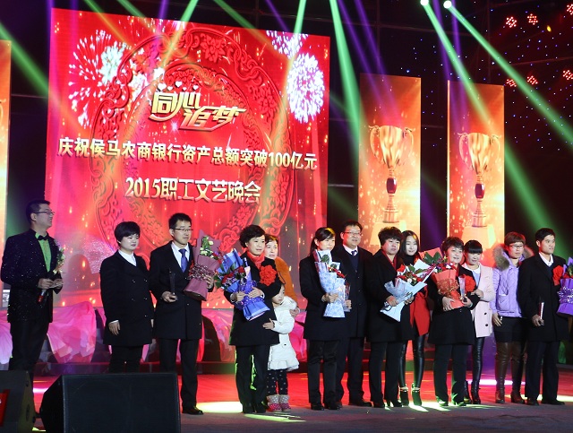 19時許,伴隨著一首溫馨的MV《商行歡迎您》,晚會正式拉開了精彩帷幕。李俊躍董事長首先發(fā)表了熱情洋溢的致辭,他講道:自掛牌四年來,在各級各部門領(lǐng)導(dǎo)的關(guān)心和支持下,全行上下勵精圖治、奮力拼搏、內(nèi)強素質(zhì)、外樹形象,取得了一系列驕人業(yè)績,并邁出了歷史性的“走出去”經(jīng)營步伐。2015年,在經(jīng)濟(jì)下行壓力加大、同業(yè)競爭日趨激烈的嚴(yán)峻局面下,全行多措并舉,逆市而上,取得了存款余額突破70億元、資產(chǎn)總額達(dá)到100億元、理財產(chǎn)品募集金額累計超17億元、資金營運利潤突破1億元、人均創(chuàng)利86.3萬元等一系列優(yōu)異業(yè)績,繼續(xù)保持了在全市、全省領(lǐng)先發(fā)展的良好態(tài)勢。本場晚會,正是給予長期以來關(guān)注、關(guān)心、關(guān)愛商行發(fā)展的各級領(lǐng)導(dǎo)、社會各界,以及商行員工及家屬的一份答謝。隨后,行領(lǐng)導(dǎo)班子、中層干部走上舞臺,與臺下的全體員工一道,在李董事長的帶領(lǐng)下齊聲宣誓商行誓詞,高呼侯馬農(nóng)商銀行企業(yè)愿景,向參加晚會的社會各界人士展示了該行團(tuán)結(jié)一心、眾志成城的精神風(fēng)貌,得到了在場觀眾的熱烈掌聲。