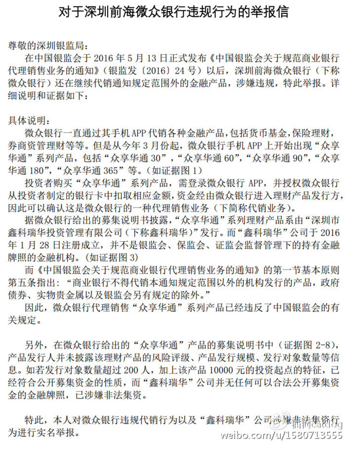 P2P觀察網(wǎng)5月23日消息,近日,網(wǎng)友“@貓狗catdog”在微博發(fā)文稱,已向深圳銀監(jiān)局實(shí)名舉報(bào)微眾銀行,并列舉了其多項(xiàng)違規(guī)行為。 該網(wǎng)友公布的舉報(bào)信顯示:根據(jù)銀監(jiān)會(huì)在5月13日發(fā)布的新規(guī)定《關(guān)于規(guī)范商業(yè)銀行代理銷售業(yè)務(wù)的通知》,微眾銀行代理銷售行為疑涉嫌違規(guī);微眾銀行“眾享華通”產(chǎn)品的融資計(jì)劃書疑為抄襲;微眾銀行“眾享華通”產(chǎn)品的募集說(shuō)明書中,產(chǎn)品發(fā)行人并未披露該理財(cái)產(chǎn)品的風(fēng)險(xiǎn)評(píng)級(jí)、產(chǎn)品發(fā)行規(guī)模、發(fā)行對(duì)象數(shù)量等信息;并且鑫科瑞華公司并無(wú)任何可以合法公開(kāi)募集資金的金融牌照,已涉嫌非法集資。 此前,21世紀(jì)經(jīng)濟(jì)報(bào)道曾發(fā)文質(zhì)疑,微眾銀行產(chǎn)“眾享華通”品的發(fā)行人、受托管理人系同一股東下的母子公司,這意味著該產(chǎn)品或涉嫌自融。另一方面,該產(chǎn)品在投資者適當(dāng)性管理、對(duì)口監(jiān)管從屬、信息披露適用法規(guī)等方面均存在監(jiān)管空白。 隨后,微眾銀行負(fù)責(zé)人回應(yīng)稱,“眾享華通”不是微眾銀行的產(chǎn)品,微眾銀行僅起到導(dǎo)流作用。該負(fù)責(zé)人還表示,微眾銀行依法合規(guī)開(kāi)展各項(xiàng)業(yè)務(wù),作為開(kāi)放平臺(tái)與各方廣泛合作,在全面風(fēng)險(xiǎn)管理的基礎(chǔ)上,業(yè)務(wù)穩(wěn)健發(fā)展。 |